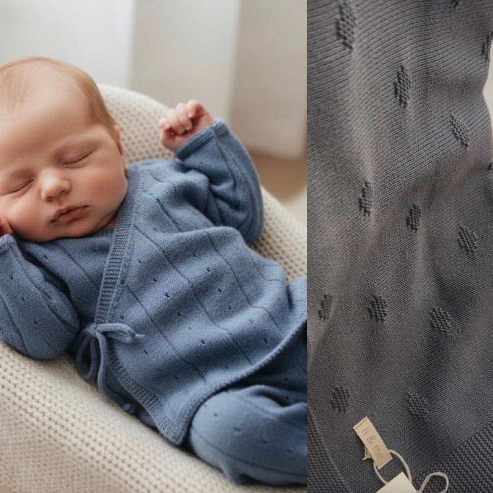 Peças tricotadas em algodão orgânico de qualidade superior e fabricados sem costuras, para o máximo conforto da pele delicada do bebé. Apresentado numa embalagem elegante, é um presente prático e memorável para recém mães e chás de bebé.