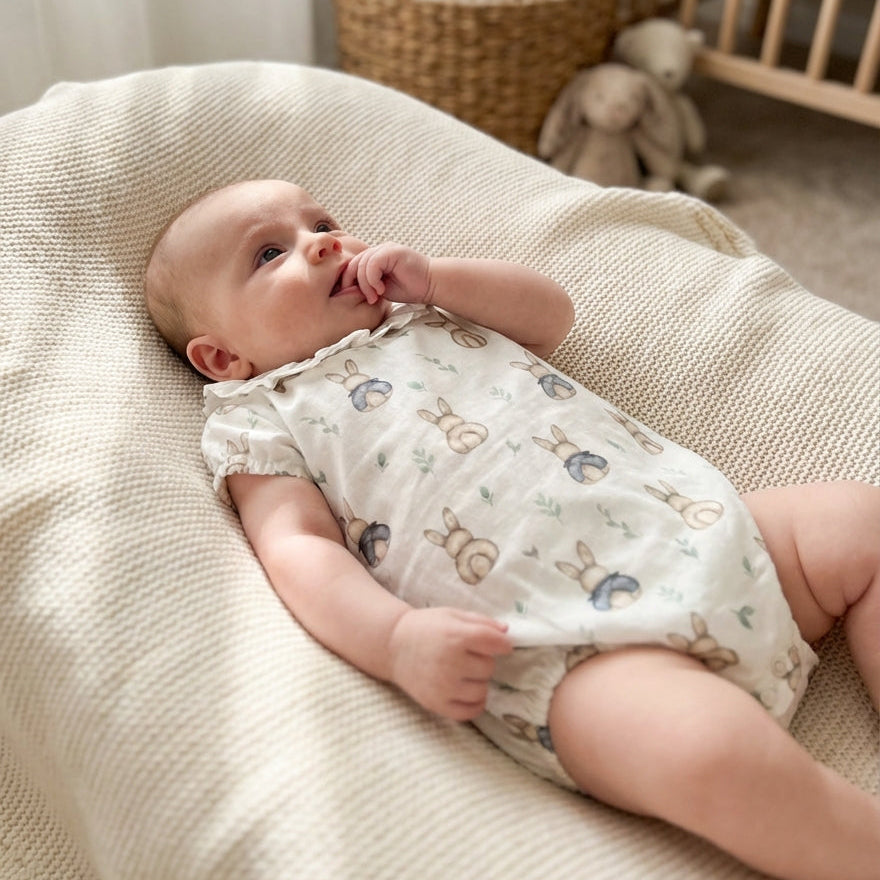 Suavidade natural em 100% algodão. Este fofo combina conforto absoluto com um toque de delicadeza, ideal para os dias mais quentes. O design delicado de coelhinhos traz um charme discreto e atemporal. Prático e funcional, com abertura simples para muda de fralda e com botões traseiros, é a peça perfeita para quem valoriza qualidade e bem-estar na pele sensível do bebé.